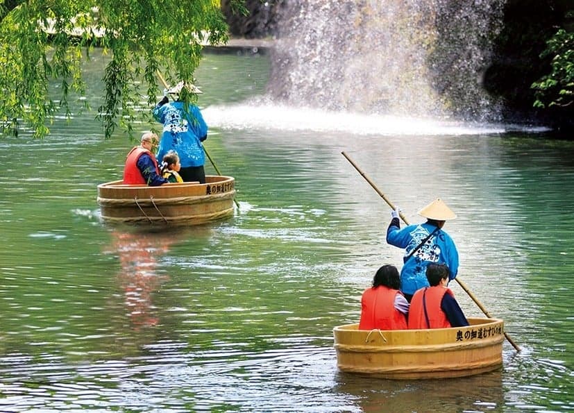 水の都と呼ばれ、水が美しく豊かな大垣。街の中心を流れる水門川を楕円形のたらい舟に乗って下ります。このたらい舟川下りは、関ケ原合戦の際に、石田三成に仕えた山田去歴の娘「おあん」が、たらいに乗って、落城する大垣城から抜け出したという戦国秘話に基づきます。新緑を眺めながらのゆったりとした川下りは格別です。(距離:約1.1km、所要時間約30分)
